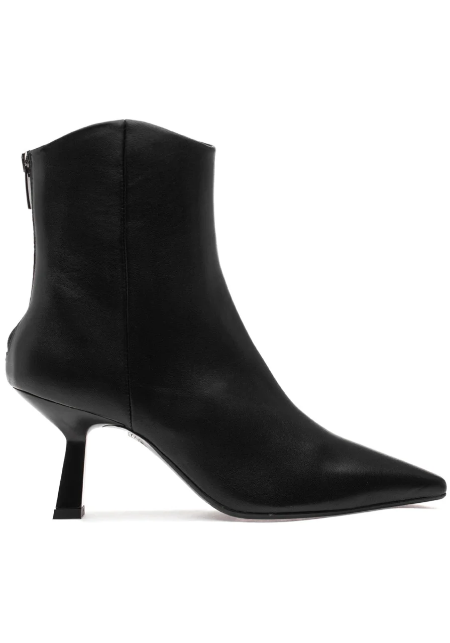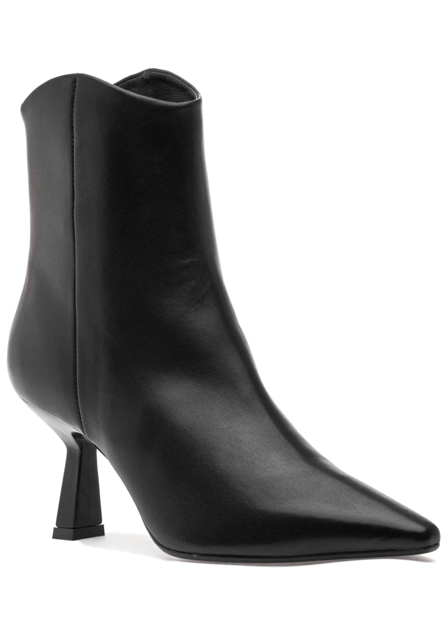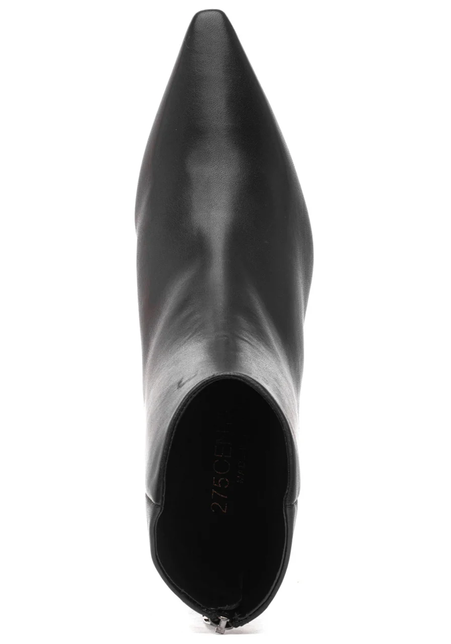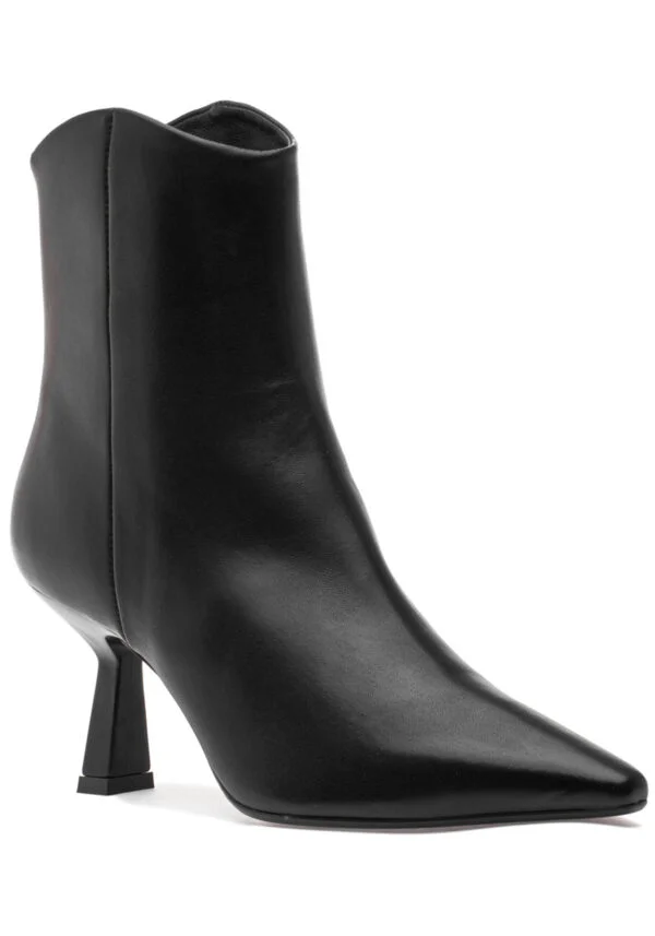 A pointed-toe ankle boot in black leather, easy to style for many occasions.