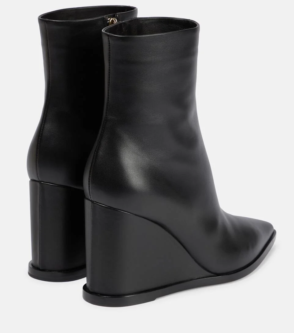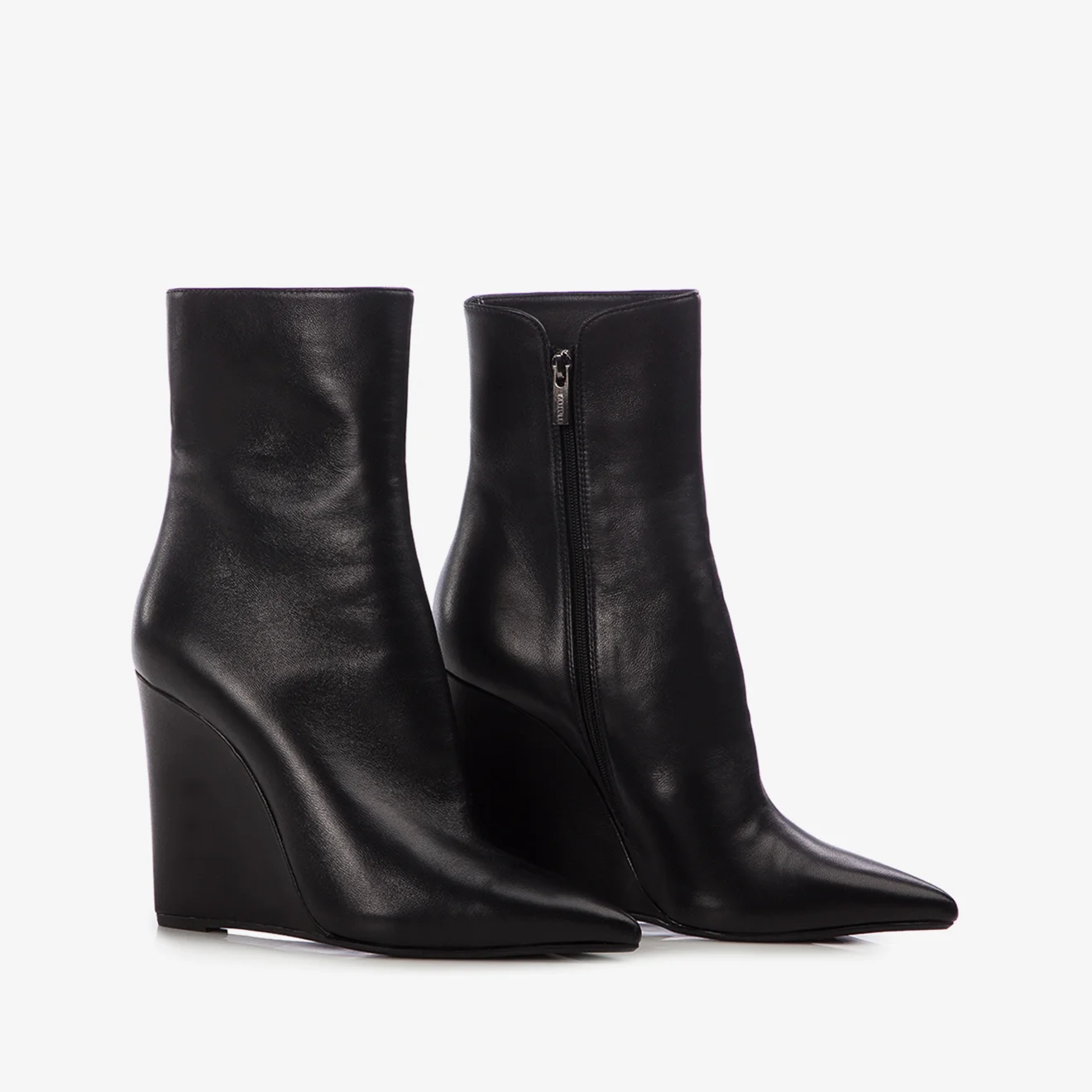 Black ankle boots with a PU Leather Upper, pointed toe, side zipper, and a sleek wedge heel—easy to style for day or night.